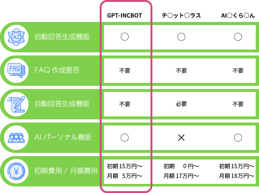 他社サービスと比較しても、GPT-INCBOTは圧倒的なコストパフォーマンスです。
